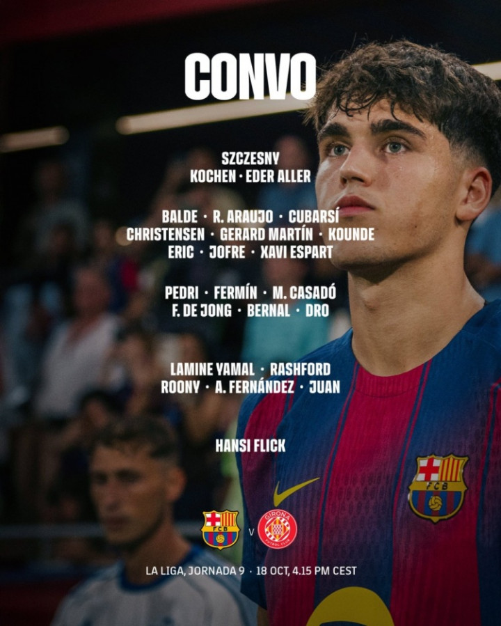 直播吧10月18日讯北京时间今天22点15分,巴萨将在西甲第9轮比赛中主场对阵赫罗纳,巴萨公布了此役的球员名单,亚马尔、拉什福德、费尔明在列,莱万、拉菲尼亚、费兰-托雷斯、奥尔莫、霍安-加西亚、加维缺席。